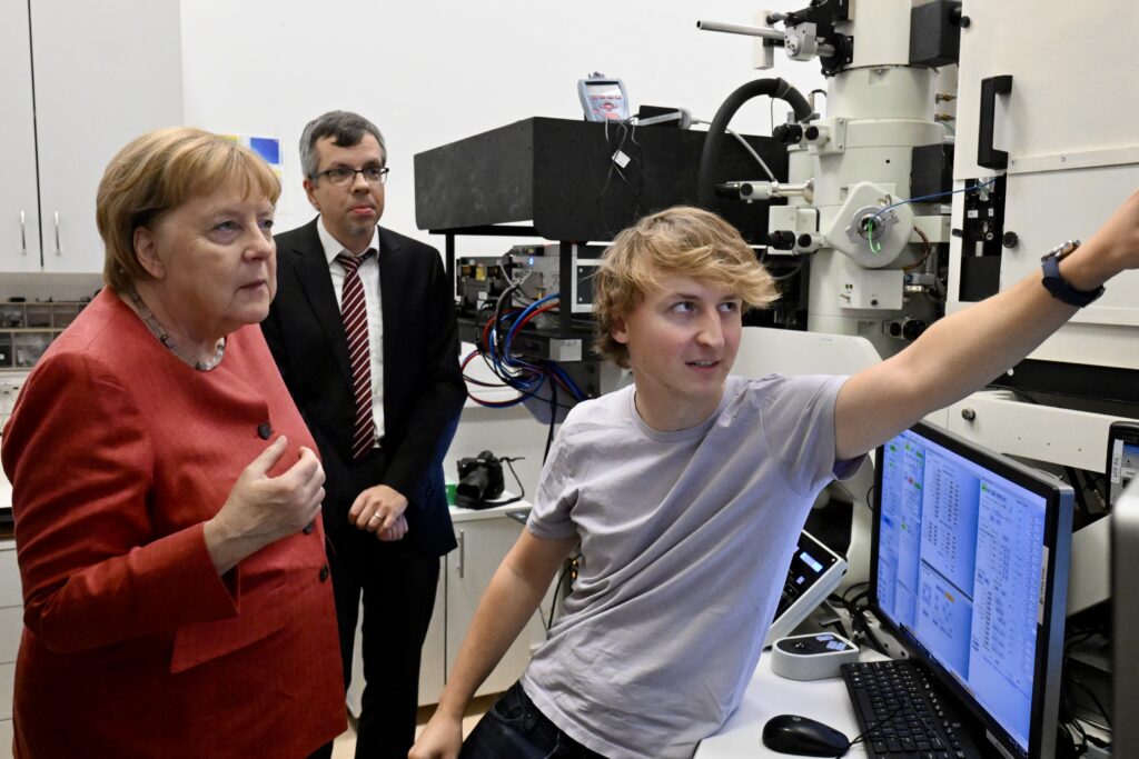 At the conclusion of her visit, Dr. Merkel toured the Electron Microscopy Center at the Faculty of Materials Science and Engineering, guided by Dr. Michael Krüger of the Faculty of Physics. She met researchers who presented several of their latest scientific innovations as part of a discussion on the development of quantum science – a field in which Dr. Merkel is well-versed.